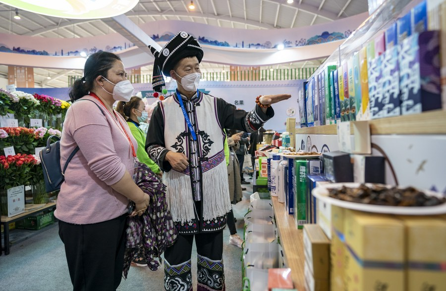 An exhibitor (R) introduces goods at the 6th China-South Asia Exposition in Kunming, southwest China's Yunnan Province, Nov. 19, 2022. (Xinhua/Chen Xinbo)