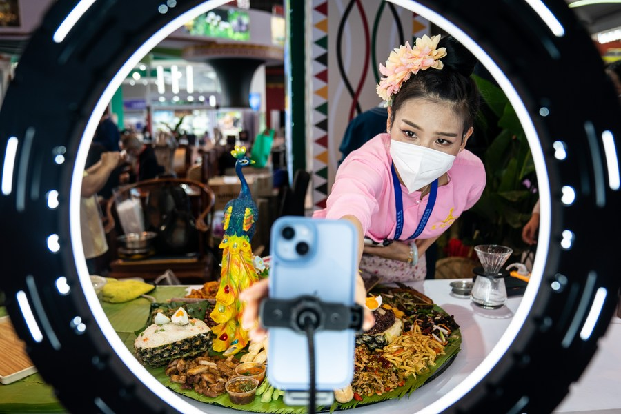 An exhibitor promotes products via livestreaming at the 6th China-South Asia Exposition in Kunming, southwest China's Yunnan Province, Nov. 19, 2022. (Xinhua/Hu Chao)